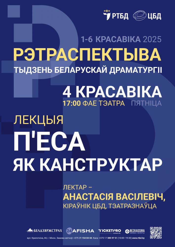 4 красавіка ў 17:00 у рамках Тыдня беларускай драматургіі “Рэтраспектыва” пройдзе лекцыя “П’еса як канструктар”.