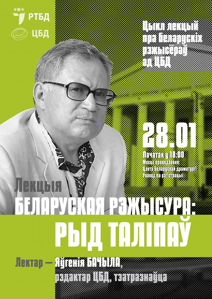 28 января (четверг) в 18:00 приглашаем вас на лекцию «Белорусская режиссура: Рид Талипов». Рид Талипов – режиссер-экспериментатор, творческий путь которого интересен своей неоднородностью: постановщик создал собственное пространство для художественных поисков, а в последующие периоды «знакомил» со своими концепциями зрителей других профессиональных театров Минска и жителей всех областных центров.