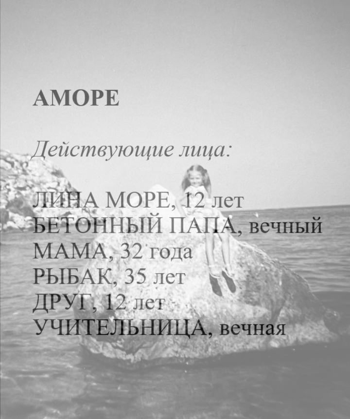Евгения. В пьесе «Аморе» ты создала необычный мир: девочка живёт на отдалённом острове, разговаривает с памятником своего отца, учит уже никому не нужный, «мёртвый язык», и всё это в обстоятельствах реалистической истории. Как родился такой контекст?