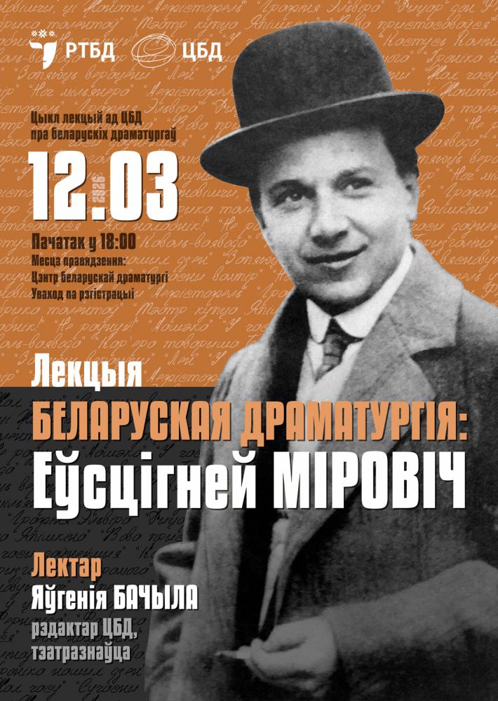 12 марта в 18:00 (четверг) состоится лекция, посвященная драматургическому наследию Евстигнея Мировича – народного артиста БССР, одного из основателей белорусского профессионального театра. О его вкладе в развитие режиссуры, актерского мастерства и театральной педагогики можно говорить бесконечно. Однако именно знакомство с пьесами автора позволит в полной мере понять все принципы, которые он отстаивал в своей деятельности, направленной на укрепление позиций белорусского театрального искусства.